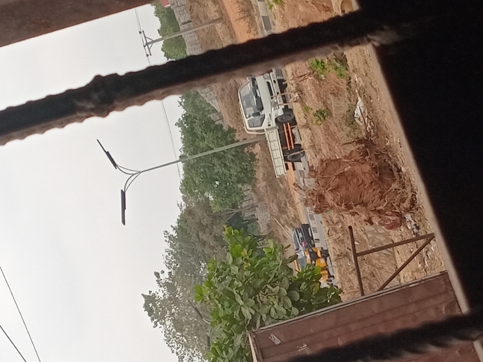 The image depicts a semi-urban scene in Dam Camp, Nigeria, under an overcast sky. In the foreground on the right, a dark, textured, vertical structural element partially obstructs the view. The midground features a paved road running from left to right. On this road, a white flatbed truck with an orange-brown bed is visible, facing left. To its left, a yellow and black auto-rickshaw (tricycle) and a dark sedan are also on the road. Adjacent to the road, on an elevated reddish-brown dirt embankment, lies a large, gnarled root ball of an uprooted tree. To the left of the root ball, a brown corrugated metal container or structure is visible. The immediate terrain surrounding the road is largely unpaved dirt with sparse green vegetation. A modern streetlight post with two dark, horizontal fixtures stands centrally in the midground. In the background, dense green trees and foliage are present. Further to the right, utility poles with overhead wires are visible, along with piles of light-colored concrete blocks, indicating construction or material storage. The sky is uniformly light gray and overcast. No specific individuals are discernible.