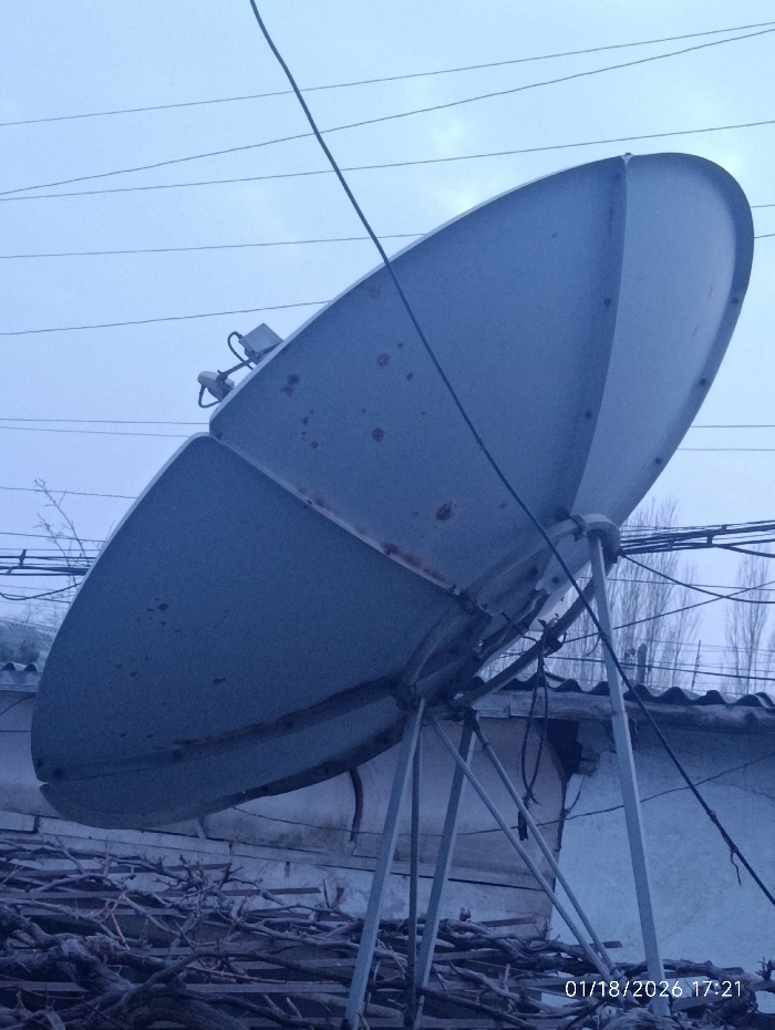 The image captures an outdoor scene in Bekabad, Uzbekistan, at 17:21 on January 18, 2026. A large, weathered grey satellite dish, composed of segmented panels and showing scattered rust spots, is prominently featured, angled upwards and to the right. It is supported by a four-legged, metallic stand. Two feedhorns with attached low-noise block downconverters (LNBs) are visible at the dish's focal point, with black cables extending from them. The sky is overcast and light blue-grey, traversed by multiple thin, dark utility wires. Below the dish and its stand, a significant accumulation of dry, intertwining branches covers the lower foreground. In the mid-ground, behind the dish, a building with a corrugated roof and a light-colored wall is partially visible, with additional dark wires running along it. No individuals or active interactions are present in the frame.