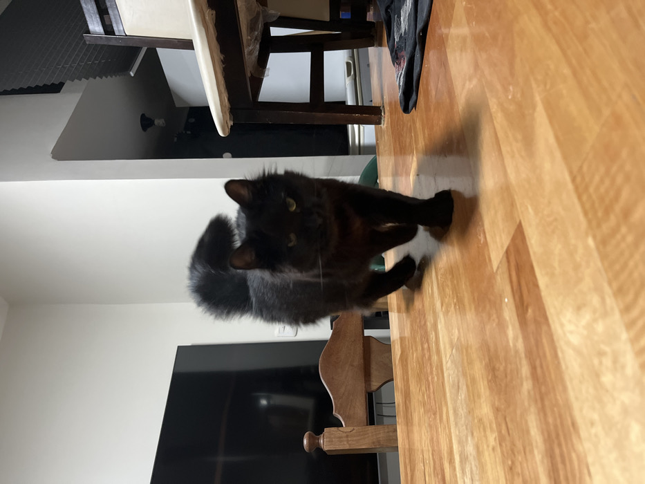 A black cat stands on a wooden floor, near a chair. The cat looks at the camera with slightly tilted head. A television is in the background. The floor's wooden planks run horizontally, while the walls are white. A chair and a black article of clothing are visible near the top of the frame. The cat's fur appears long and fluffy.