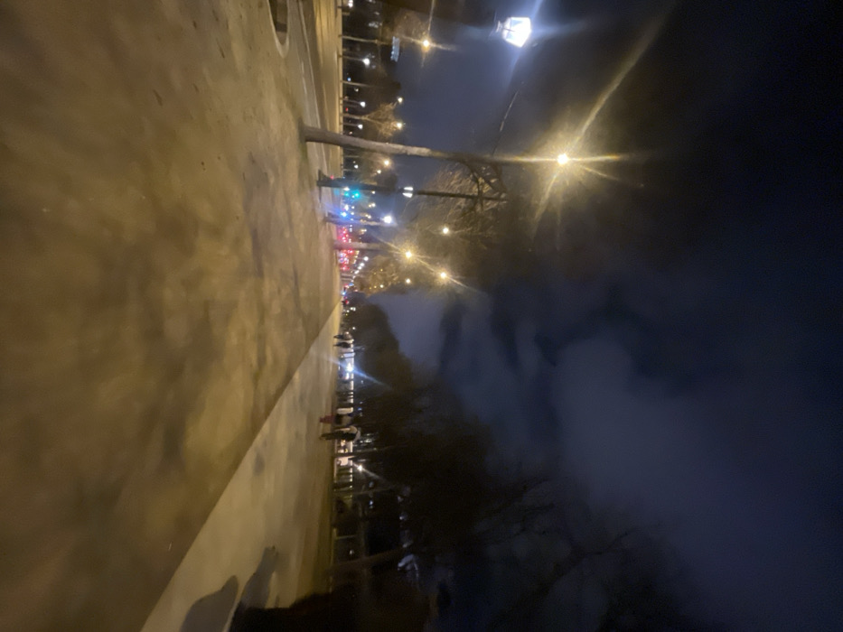A nighttime cityscape is dominated by bright streetlights lining a wide promenade. People walk along the path, illuminated by the warm glow. The right side is engulfed in hazy darkness, possibly fog or smoke, obscuring trees. The left side features a concrete walkway with lampposts stretching into the distance, leading to blurred traffic lights and taillights.
