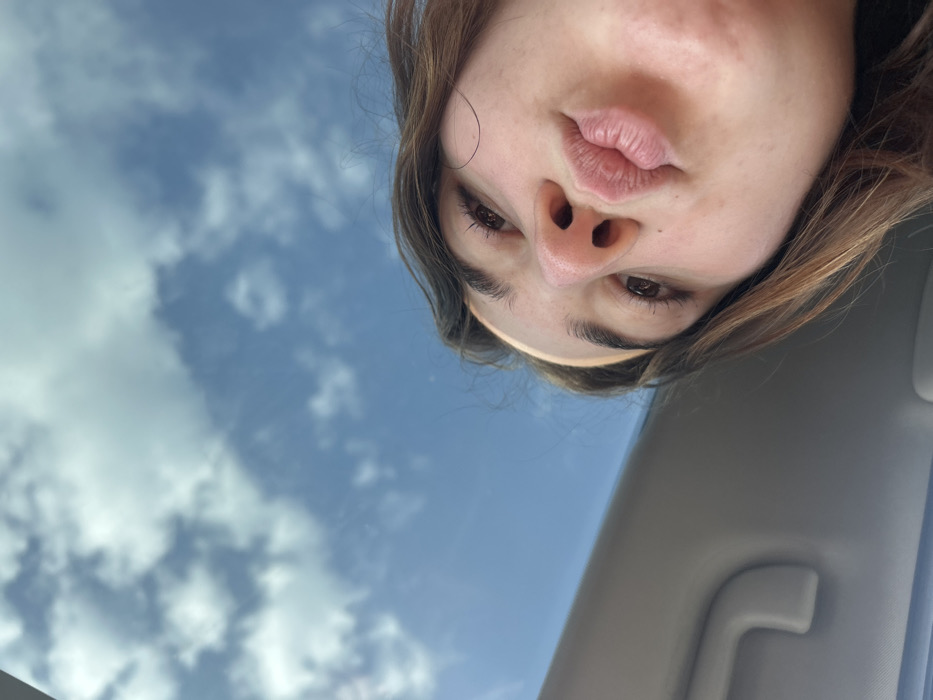 A low-angle selfie captured within the interior of a vehicle, in Kehl, Germany, shows a young female from the forehead to the chin, positioned in the lower right of the frame