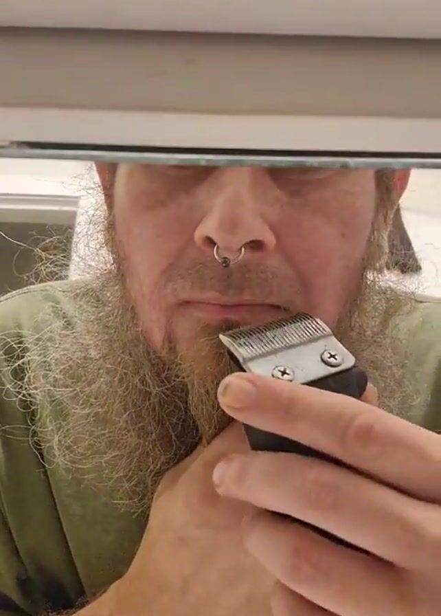 - "man trimming his beard with electric clippers in front of a bathroom mirror" by FM-6Oefw1, licensed under CC BY 4.0