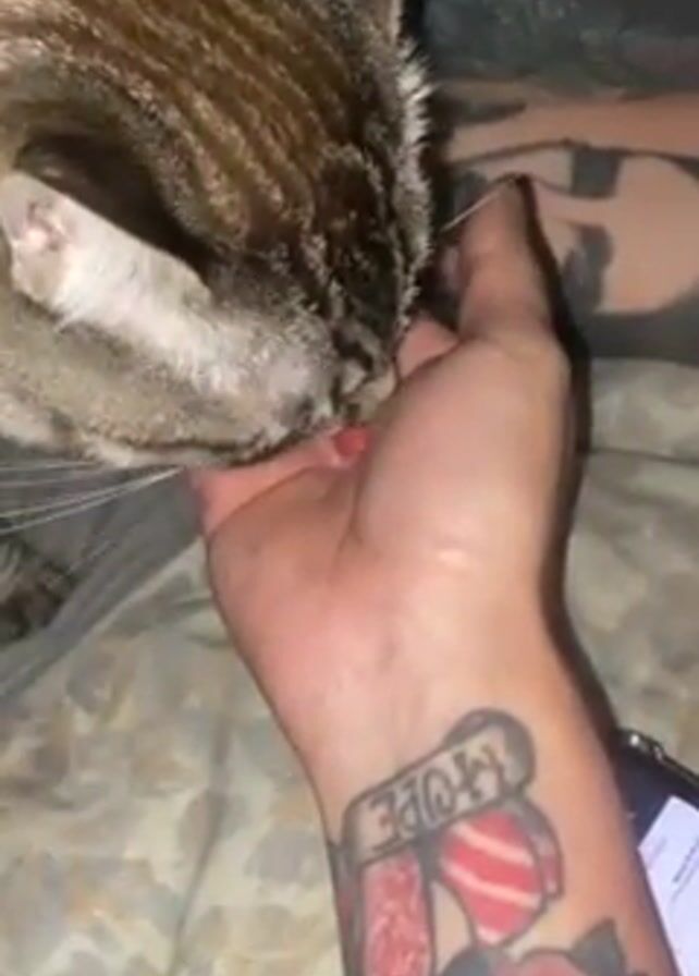A person is holding their hand out for a gray tabby cat, which is licking something from their palm. The person has several tattoos on their wrist and forearm, including one that reads "HOPE" inside a banner. A smartphone is next to the person's hand. The person and cat are on top of a floral patterned blanket.