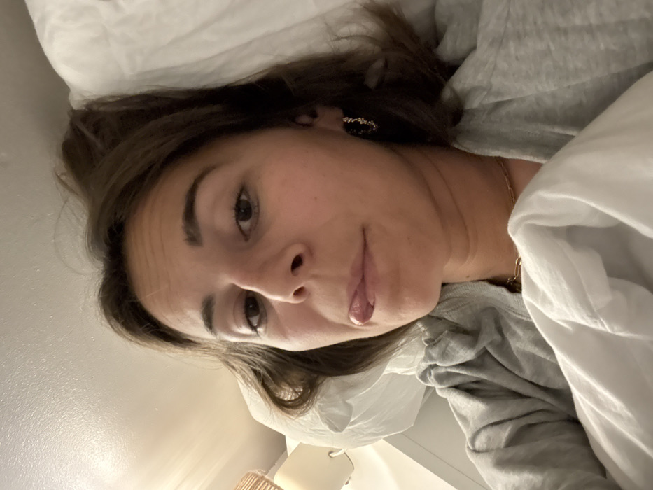A fair-skinned woman with brown hair and hazel eyes gazes directly at the camera. She is lying in bed, surrounded by white and grey bedding. She wears a grey sweatshirt and gold jewelry, including earrings and a necklace. The scene is lit with warm, dim light, suggesting a cozy, relaxed atmosphere. Part of a bedside lamp is visible in the lower left corner.