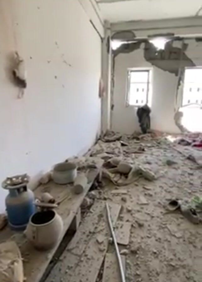 interior of a room heavily damaged. Debris covers the floor, including what appears to be fragments of the wall and ceiling. There are shoes, plastic containers, and pieces of clothing scattered about. The walls have large holes, and the window frames are damaged. A shelf along one wall holds various objects including a blue gas canister, pots, and wrapped items. There's also a reddish stain on the wall. The room is lit by daylight coming through the windows, indicating it's daytime.