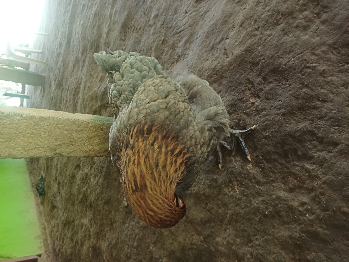 - "A single chicken, displaying brown and black striped plumage on its head and neck and grayish-blue feathers on its body, stands on a dark brown, textured packed earth ground" by FM-wxsQB3, licensed under CC BY 4.0