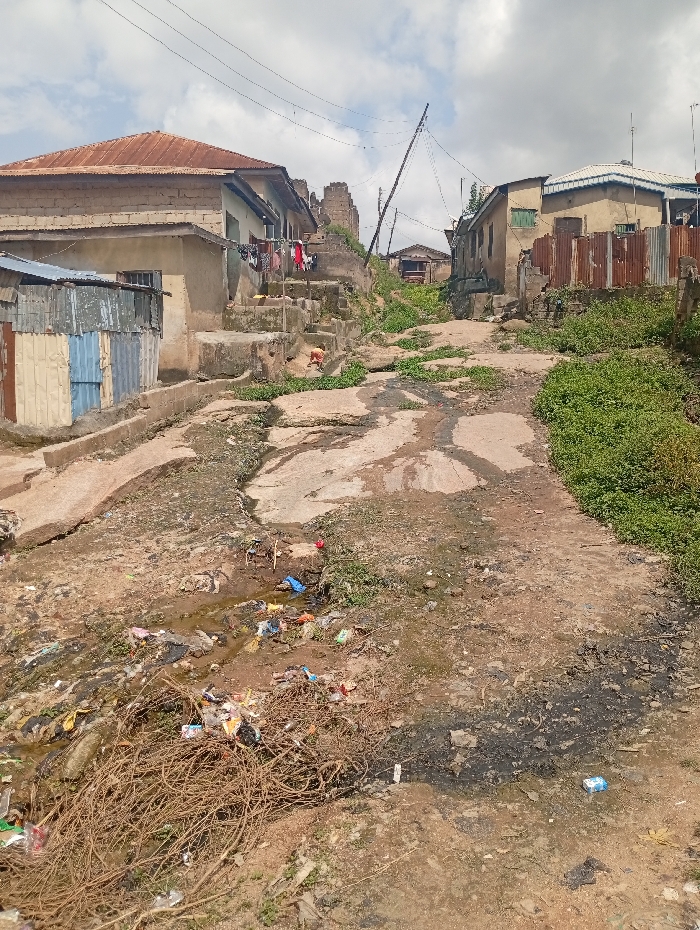 The image depicts an upward-sloping, unpaved dirt and gravel pathway in a residential area of Madalla, Nigeria, under an overcast sky