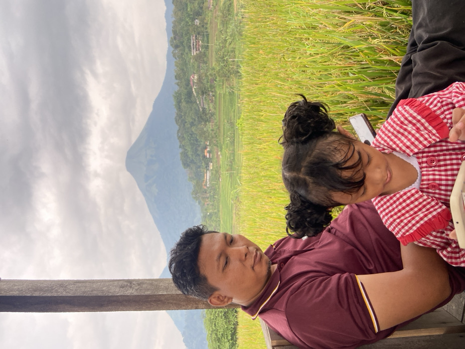 This image depicts an outdoor scene in Tamiajeng, Indonesia, featuring two individuals against a natural landscape