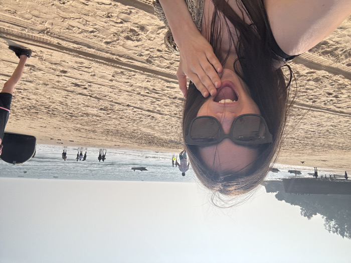 An outdoor scene depicts Sinquerim Beach in Sinquerim, India, under bright daylight. In the foreground, a young adult female with long, dark hair, wearing dark sunglasses and a dark top, faces the viewer. Her mouth is open in a wide expression, and her right hand is placed near her chin. The sandy beach dominates the midground, featuring numerous footprints and distinct tire tracks traversing parallel to the waterline. To the left, several small fishing boats are beached near a distant, fortified coastline or rocky outcrop topped with sparse vegetation. Multiple figures are scattered across the beach and along the water's edge. In the mid-right, the lower torso and legs of an individual wearing black shorts with pink trim and black athletic shoes are partially visible next to a large, dark, possibly inflatable object resting on the sand. The background shows the Arabian Sea with a clear horizon. Several individuals are visible wading or standing in the shallow water. At least one jet ski or small speedboat is active on the water, with other distant vessels present. The sky is clear, appearing light blue to white, suggesting a sunny day.