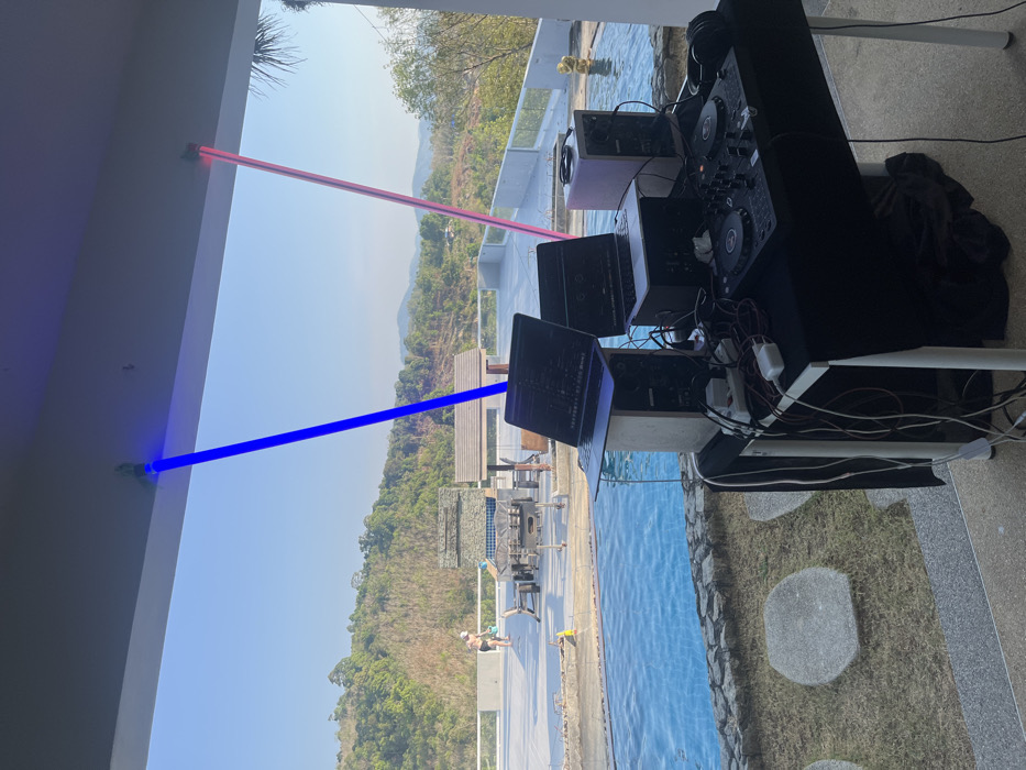 The image depicts an outdoor entertainment setup at a private villa or resort located in Kamala, Thailand. In the foreground, a white table draped with a black cloth holds DJ equipment, including a Pioneer DJ mixer/controller, two laptops (one on a concrete block, one on a metal stand), two speakers (one gray, one white), and a complex tangle of power cables and strips. Headphones are resting on the right speaker. Above this setup, two glowing tube lights, one blue and one pink, are suspended diagonally from an overhead white structure. Beyond the DJ station, a blue swimming pool with stone edging is visible. On the far side of the pool, a light-colored tiled patio features outdoor furniture, including a table with chairs and a stone-clad barbecue grill. A single individual, dressed in a white cap, light top, and dark shorts, is visible standing near the patio's edge, seemingly performing an activity with hands near the ground. The background reveals a vast, clear blue sky above a verdant, undulating hilly and mountainous landscape, characteristic of tropical terrain. The scene is illuminated by natural daylight.