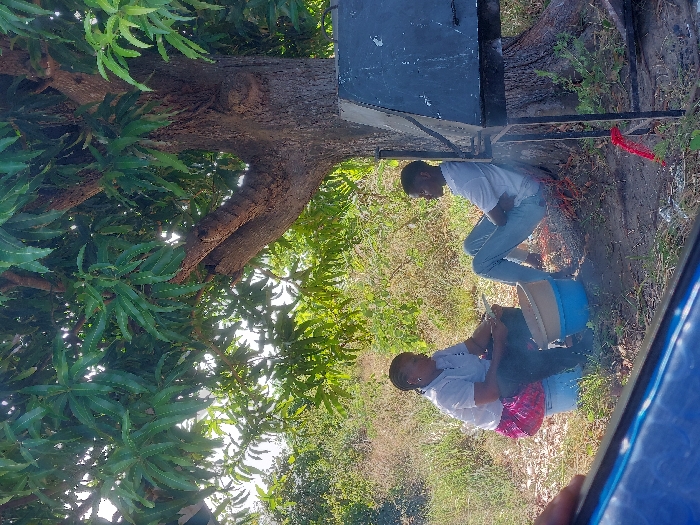 The scene is set outdoors in Dar es-Salaam, Tanzania, under the substantial canopy of a large tree with dense green foliage, consistent with a mango tree, within an area of sparse dry vegetation and bare earth