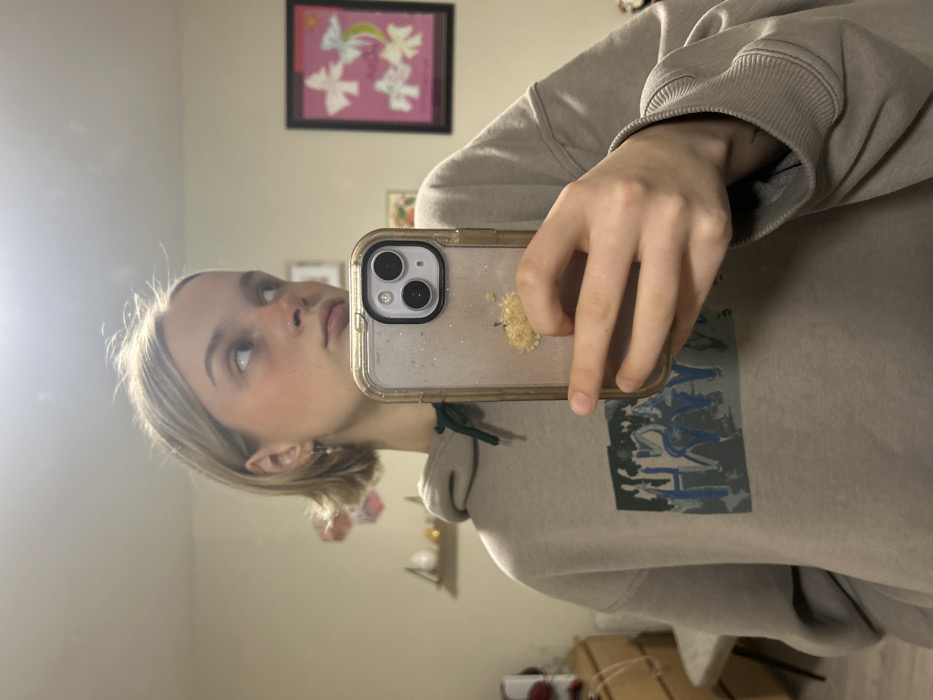 An individual, appearing female, with short blonde hair and fair complexion, is depicted from the chest up, taking a mirror selfie indoors. They are wearing an oversized, light beige hooded sweatshirt with a dark green drawstring and a stylized blue and grey graphic print on the front. A small silver stud is visible on their right nostril, and a small drop earring on their left earlobe. The individual's gaze is directed slightly upwards and to their left (viewer's right). Their left hand holds a smartphone, an iPhone with a dual-camera module, encased in a clear, glittery protective case featuring a dried botanical element. A faint tattoo is visible on the individual's inner left wrist. The background, a reflection in the mirror, shows a room with light-colored walls. To the individual's right (viewer's left) are shelves holding decorative objects, including a white ceramic item and a spherical gold-toned object. To the individual's left (viewer's right), a framed artwork with a pink background, white ribbon-like designs, and green elements is mounted on the wall. A light-colored wooden dresser and a chair with a grey upholstered seat are partially visible in the far left of the frame. The specific location within the city of Vancouver, Canada, cannot be determined from the visual information provided.