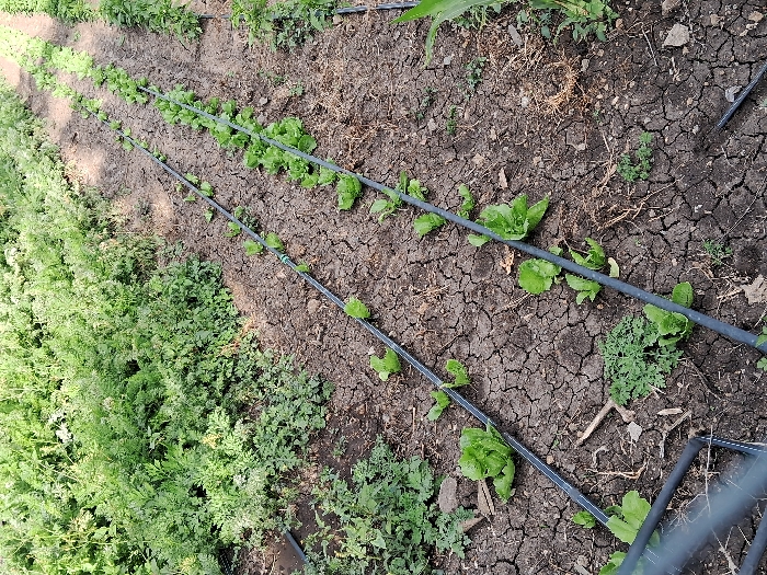 This image displays a cultivated agricultural field within Ongata Rongai ward, Kenya. The foreground and midground feature two parallel rows of young, green lettuce plants growing in dark brown, cracked soil indicative of dry conditions. Each lettuce row is accompanied by a black drip irrigation line with visible emitters. Between these rows, sporadic weeds and a larger green plant with lobed leaves are present. The background, particularly on the left, shows a dense growth of mature green foliage, characteristic of carrot plants, with some small white flower clusters visible within. A young corn stalk is partially visible on the far right. A bent black metallic or plastic structural element is visible in the bottom-left corner. No individuals are present in the scene.