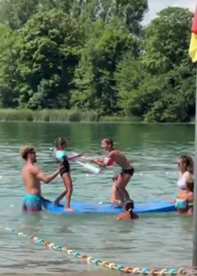 group of people playing in the water. Two young girls on a blue floating mat in shallow water engage in a mock sword fight using what appear to be pool noodles. A man stands waist-deep beside the mat, seemingly supervising. Other individuals, including a woman and children, are also in the water, some nearby the mat. The scene is at a beach or lakeside, marked by a roped-off swimming area and a sandy shore. Trees are visible in the background. The weather appears sunny and pleasant.