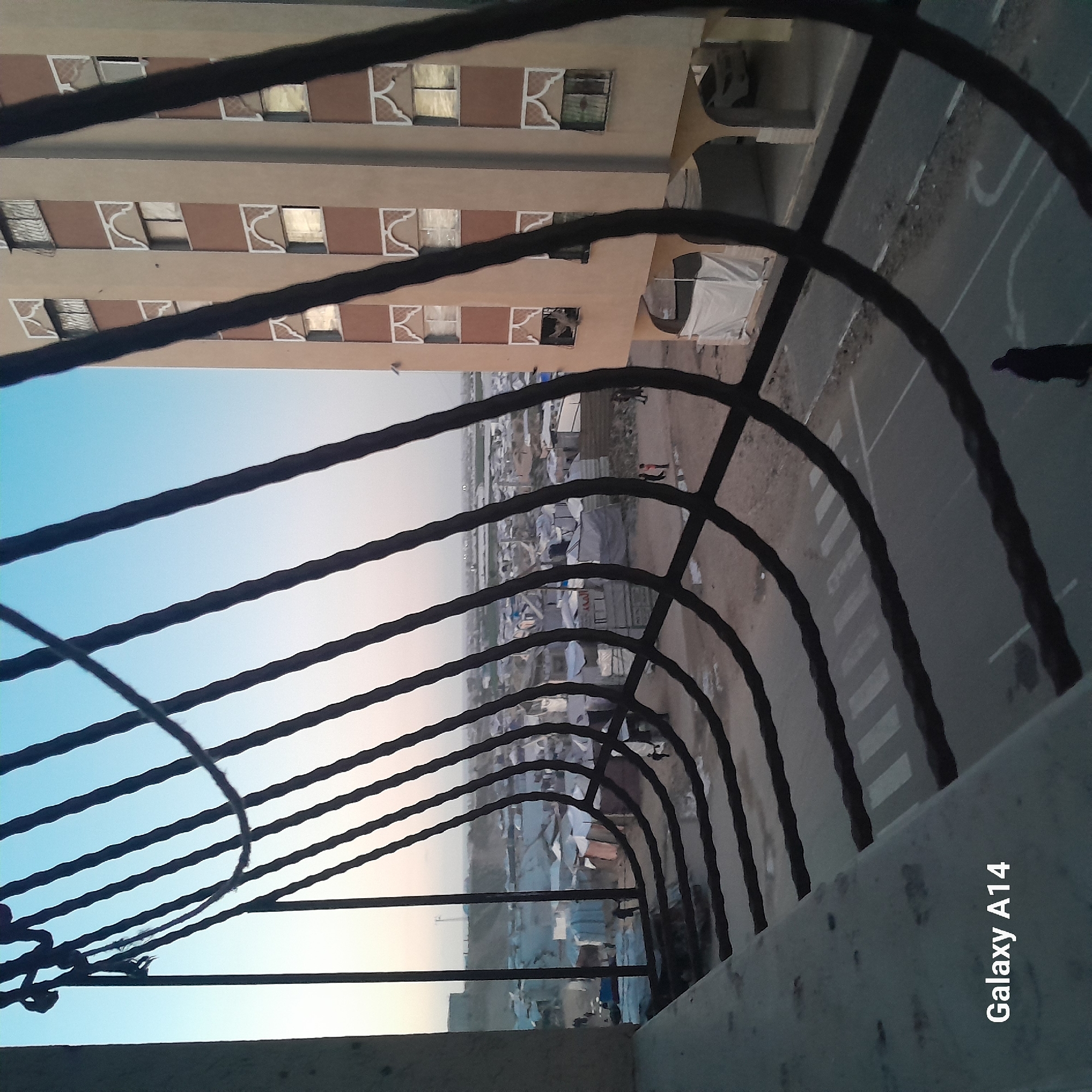 The image depicts an elevated perspective of a cityscape, likely Khan Yunis, Palestinian Territory, viewed through a dark, wrought-iron railing. The scene includes a multi-story building with distinct architectural details on its façade, a road with pedestrian crosswalks, and a densely populated area appearing to contain numerous shelters or tents. Several individuals are visible at ground level. The sky transitions from blue to a light grey/beige near the horizon.
