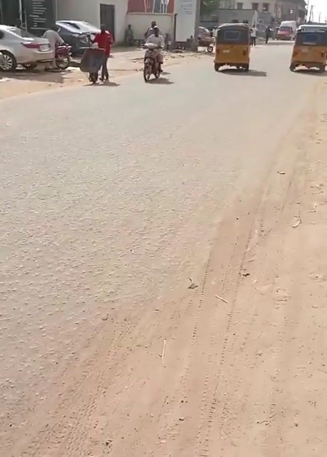 street scene in what appears to be a developing country. The road is paved but has visible wear and tear, with sandy or dusty shoulders on either side. There are several buildings visible along the street, including what appear to be a branch of Jaiz Bank and a GTCO (Guaranty Trust Company) building. Cars are parked in front of the bank. People are seen walking along the street, and there are also motorcycles and auto rickshaws (tuk-tuks) moving along the road. One man is pushing a wheelbarrow. The overall impression is of a busy, everyday scene in a relatively warm climate.