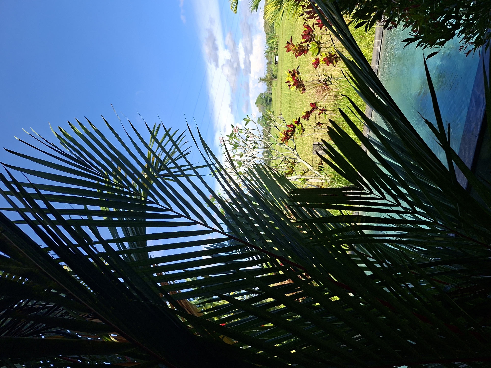 The image depicts a scene from Lodtunduh, Indonesia, showcasing a vibrant outdoor setting. The foreground is dominated by the dark, dense foliage of palm leaves, obscuring portions of the view. Glimpses through the leaves reveal a bright blue sky with scattered white clouds and a lush green landscape featuring a rice field. A swimming pool with clear blue water is partially visible on the right side of the frame. Other plants with colorful leaves add to the tropical ambiance. The lighting is varied, with direct sunlight illuminating some areas while others are shaded by the foliage.