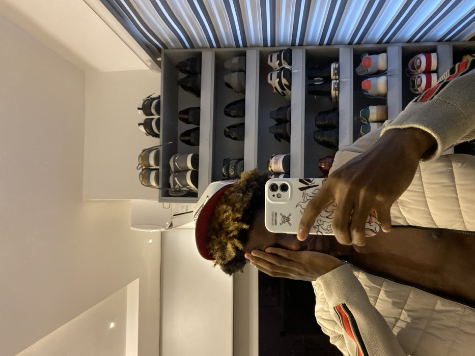 A male individual with dark skin and short, curly blonde-tipped hair is depicted in a mirror selfie taken indoors