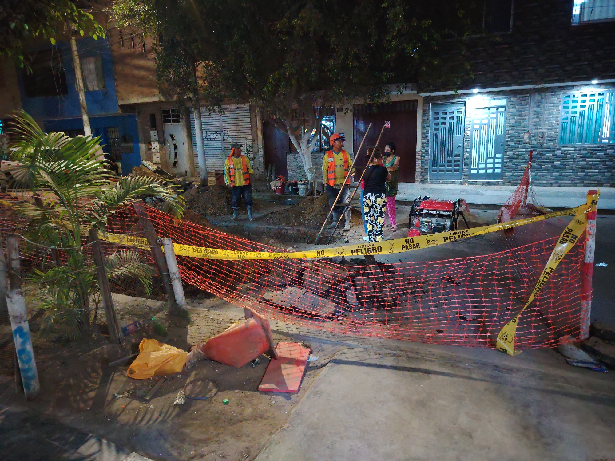 At night in Trujillo, Peru, construction workers are present around an excavation site on a street. The site is demarcated with orange plastic netting and yellow caution tape that reads "OBRAS PELIGRO NO PASAR." Two men wearing orange vests and hard hats stand near the open pit, one holding a pole. Nearby, two women wearing face masks stand next to a small generator. Tools and other equipment are scattered around the pit. A palm tree is visible to the left, and residential buildings are visible in the background.