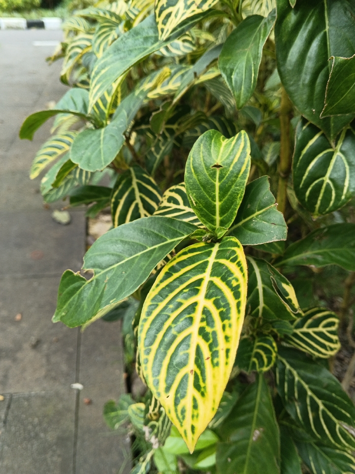 The scene is situated in Ho Chi Minh City, Vietnam, and presents a close-up, vertical photograph of a dense, variegated plant. The foliage consists of numerous green leaves with prominent, bright yellow venation forming distinct patterns. A large, ovate leaf, displaying these striking yellow veins, occupies the lower-center foreground. Several other leaves show minor insect damage, characterized by small holes or slightly ragged edges. To the left, a grey concrete paved surface, resembling a sidewalk or pedestrian path, runs parallel to the plant's base. This paved area is separated from the plant's growing bed by a dark grey curb. The background behind the plant and curb is intentionally blurred, indicating an urban or roadside environment. No individuals, animals, or specific actions are depicted. No distinctive architectural landmarks are visible to pinpoint a precise address within the city.