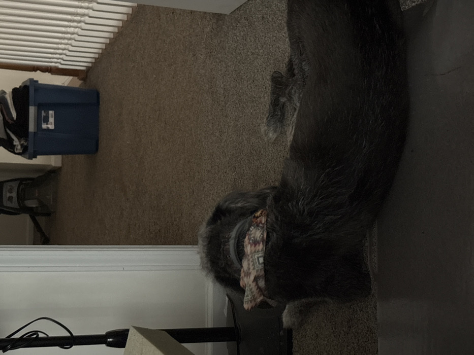 A gray shaggy dog lies on a brown carpet near a wall and dark floor. The dog wears a patterned bandana around its neck. A blue storage bin and a vacuum cleaner sit near a white banister in the background. Part of a microphone and stand are visible in the foreground.