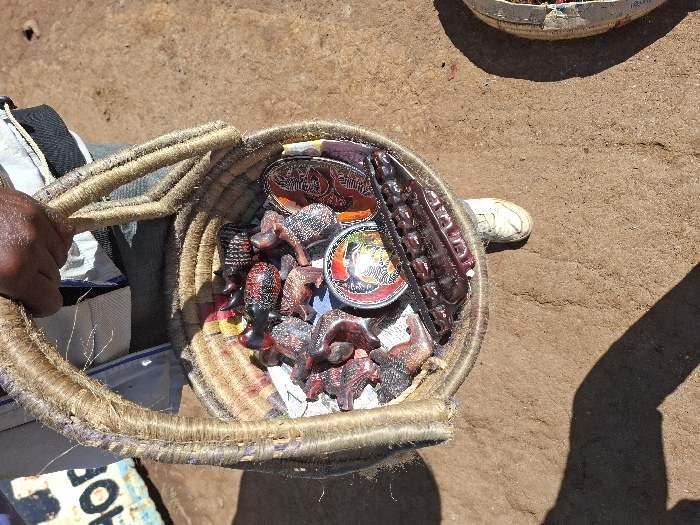 A person is holding a woven basket filled with various wooden carvings, including small animals and figures, along with painted ceramic plates. The basket is made of natural fibers and has a sturdy handle. The person is standing on a dirt path in Escarpment, Kenya, at coordinates -1.023, 36.622. The person's leg, wearing a white shoe, is visible in the lower right corner of the frame. The scene is illuminated by the bright sunlight, casting a shadow from the person and basket onto the ground. The background features a blurred view of the path and other objects in the distance.