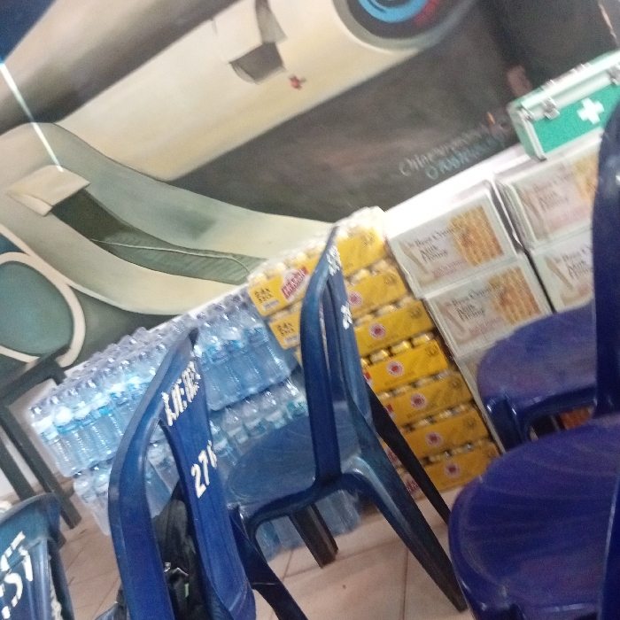 retail setting in Nsukka, Nigeria. Blue plastic chairs are in the foreground, obscuring a display of bottled water, boxes of "La Best Cream Cracker Milk Honey" biscuits, and packages of yellow-wrapped goods, possibly candy. A first aid kit sits on the shelf above the biscuit boxes. The wall behind the display features a mural depicting an aircraft. The angle of the shot suggests the photo was taken from a low vantage point.