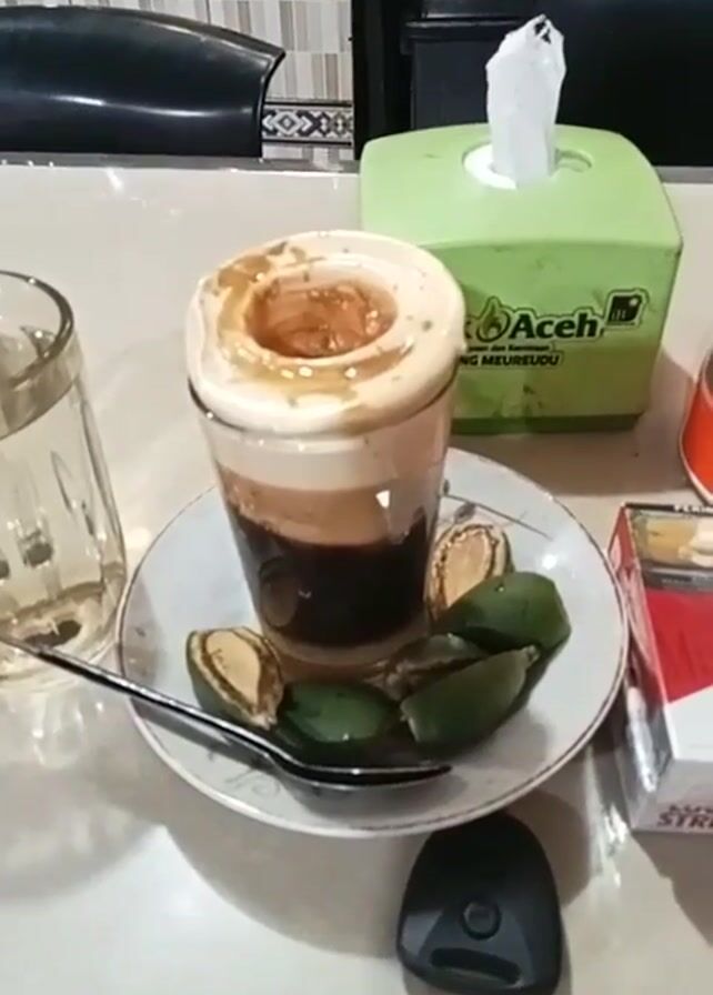 - "table with a coffee drink, a glass of water, a pack of cigarettes, an ashtray, a box of tissues, a few sliced green fruits, a spoon, and a small black object" by FM-KF3a73, licensed under CC BY 4.0