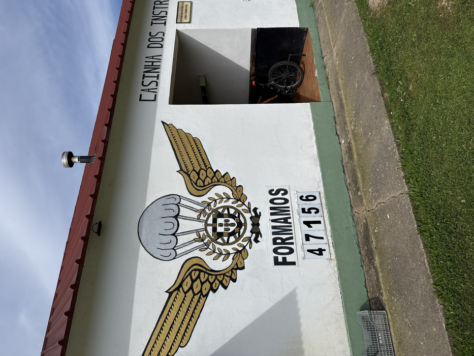 An outdoor daytime scene depicts the front exterior of a single-story building in Praia do Ribatejo, Portugal. The structure features white walls with a dark green baseboard and a red corrugated metal roof, from which a black pipe topped with a silver cap protrudes. A small, dark-colored light fixture is mounted on the wall below the roofline. On the left section of the white wall, a large painted emblem is visible: a grey parachute flanked by gold wings, encompassing a wreath that frames the Portuguese coat of arms. Below this emblem, the word "FORMAMOS" is painted in black capital letters. Directly beneath "FORMAMOS," the numbers "47156" are displayed on five individual white rectangular tiles with black borders. To the right, an open, rectangular alcove is cut into the building's facade. Inside the alcove, a brown and black mountain bicycle, accented with red components on its seat and water bottle cage, is parked on a reddish-brown tiled floor. The interior walls of the alcove are dark. Above the alcove opening, the phrase "CASINHA DOS INSTRUTORES" is painted in black capital letters. A small white sign with black text, partially visible on the right interior wall of the alcove, reads "CENTRO DE INSTRUÇÃO AERO-TERRESTRE." In the immediate foreground, a cracked concrete path runs parallel to the building. To the far left of the path, a grey plastic crate rests on the ground. Beyond the path, an area of green grass is visible. The sky overhead is clear blue with scattered white clouds. No individuals are present in the scene.