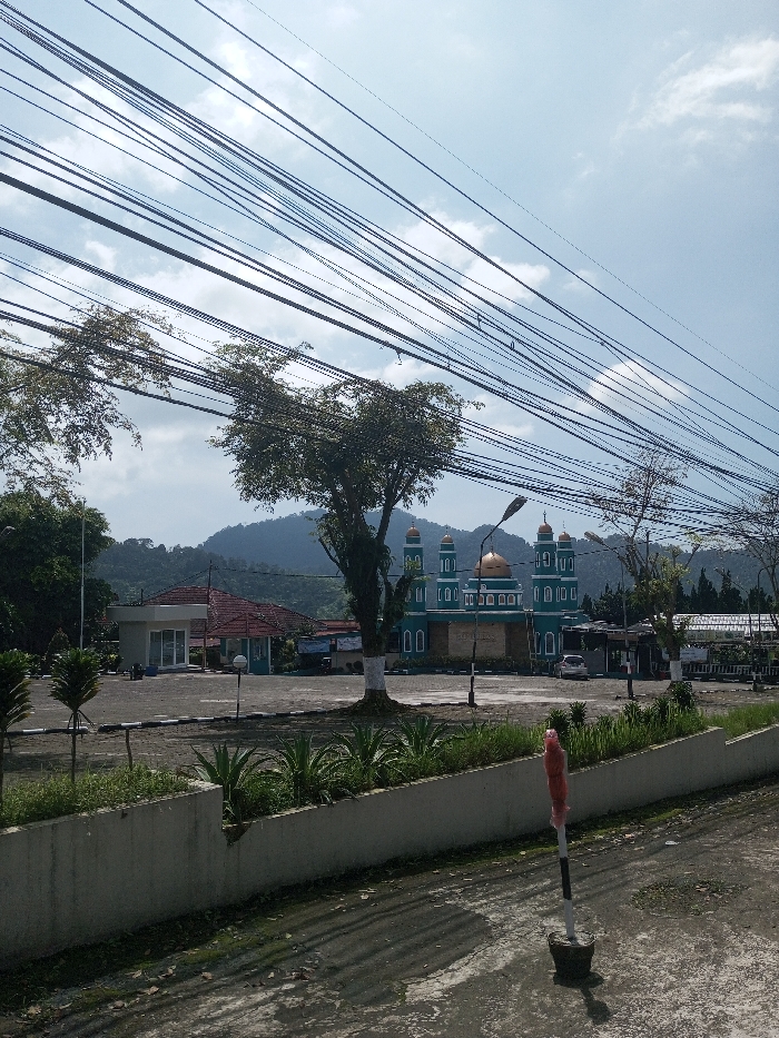 The image displays an outdoor daytime scene in Beteng_Pangkhar_Somthrang, Bhutan. In the midground, a teal-colored mosque with white accents, multiple domes including a central golden dome, and two flanking minarets is prominent. A large deciduous tree with a white-banded trunk stands to the left of the mosque in a wide, paved area. Further left, a single-story building with a red-tiled roof and white walls is visible. A white vehicle is parked in the paved area near the mosque. The foreground features a concrete planter box containing green vegetation, and in the lower right, a black and white striped pole with red material wrapped around its top. The background consists of green, forested mountains under a light blue sky with scattered white clouds. Numerous overhead utility lines span across the upper portion of the frame. No individuals are present in the scene.
