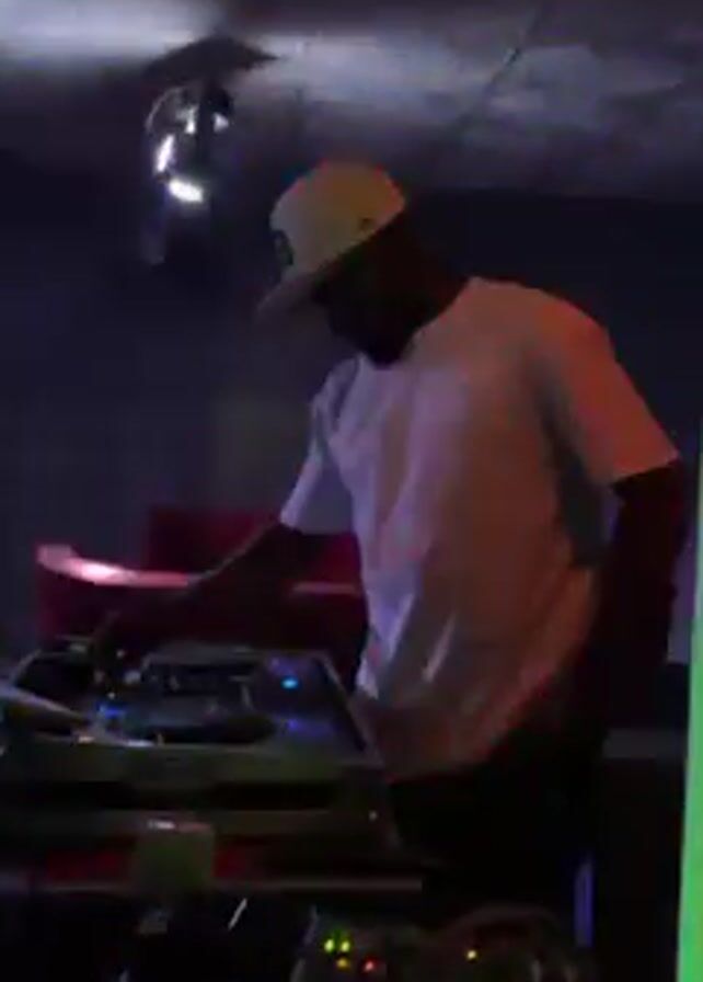 A man wearing a white t-shirt and a baseball cap stands at a DJ console in a dimly lit room