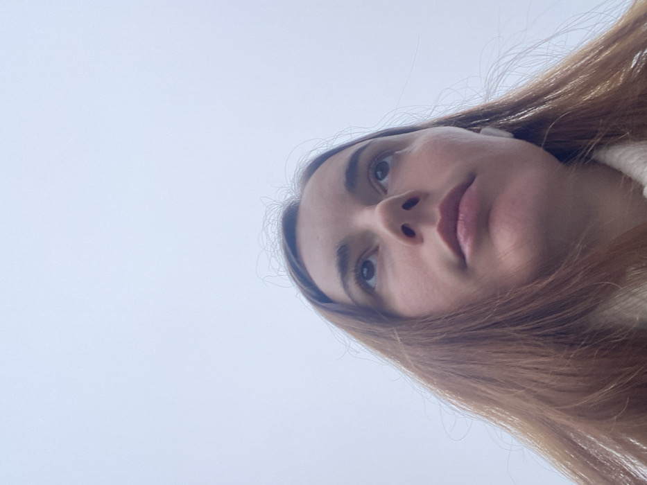 A young adult female with long, reddish-brown hair is depicted from a low-angle perspective, looking upwards and slightly to the viewer's left, against an overcast or bright, featureless light-grey sky