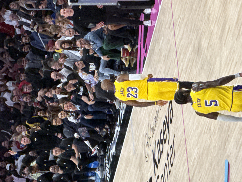The image captures an indoor basketball game scene within the Kaseya Center in Miami, Florida, United States. Two male professional basketball players are central on the wooden court, viewed from behind. The player closer to the foreground wears a yellow jersey with "AYTON" and the number "5" printed in blue on the back. The player slightly further away wears a yellow jersey with "JAMES" and the number "23" in blue on the back, distinguished by a white sleeve on his left arm and a yellow wristband on his right. The court surface displays the "Kaseya Center" logo. Behind a black barrier separating the court, multiple rows of spectators are visible in various courtside and tiered seating arrangements. In the upper left background, a male spectator in a black long-sleeved shirt raises his right hand, making a peace sign. To the right, a male staff member in a black short-sleeved shirt with a Nike logo stands courtside, facing the court with his hands on his hips. A red and white container is visible on the floor near the courtside spectators. A blue mat rests on the court floor in the lower left quadrant.