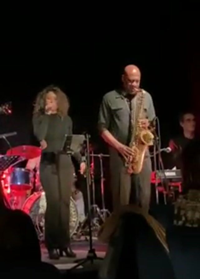 A musical performance takes place on a stage with a woman singing, accompanied by a saxophone player, a keyboardist, a drummer, and another musician who is only partially visible. The singer stands behind a music stand and holds a microphone, while the saxophonist plays. The keyboardist plays while looking at the sheet music and the drummer sits behind the drum set. The stage is dimly lit, with red lighting highlighting the drum kit. The audience, who are visible at the bottom of the frame, is watching the performance, with some members clapping.