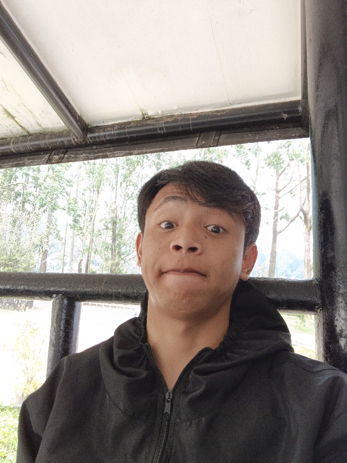 A close-up, eye-level photograph displays a young adult male, of apparent Asian descent, positioned centrally. He has short, dark hair and is wearing a dark, zippered, hooded jacket. The subject is looking directly into the camera with wide eyes and a distinctive facial expression characterized by raised eyebrows and pursed, slightly downturned lips. He is situated under a shelter, behind a dark, multi-barred metal frame. Above his head, a dirty white ceiling or underside of a roof, supported by dark metal beams, is visible. The background, viewed through the frame, reveals an outdoor wooded area with numerous tall, slender trees and green foliage, under a bright sky. Faint hills are discernible in the distance. The scene is located in Cimacan, Indonesia.