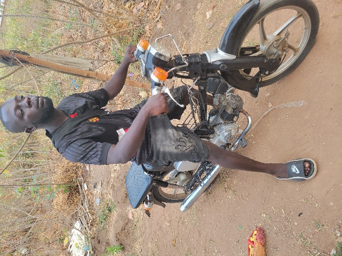 A man sits on a small, black motorcycle outdoors in a dirt area. He wears a black shirt, dark shorts, and sandals. The motorcycle is in the foreground with the front wheel visible. The background includes trees and some trash scattered on the ground.