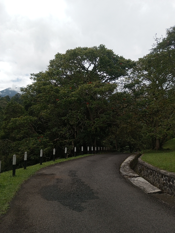 The scene displays an asphalt road in a forested, mountainous area in Kanand, India. The dark grey road surface, visible in the foreground and curving to the right, exhibits damp patches. No individuals are present. Along the left edge of the road, a series of short, uniformly spaced, dark cylindrical bollards with white tops stand on a narrow strip of green grass. Beyond these bollards, dense green foliage of trees extends upwards, with some trees displaying small red clusters. The right side of the road is bordered by a low retaining wall constructed from irregular dark stones, topped with a concrete drainage channel. Above this wall, a manicured green grassy slope rises towards additional dense tree cover. In the distant left background, a mountain peak is partially obscured by an overcast, grey sky. The overall environment is rural and natural.