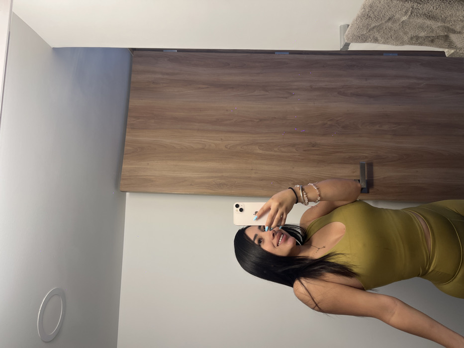A woman in a light green athletic outfit takes a mirror selfie. She holds a white iPhone. She is fair-skinned with long, black hair. Her jewelry includes a dainty necklace, multiple bracelets, and painted fingernails. The background includes a brown, wood-paneled cabinet, a white wall, and a circular, recessed light fixture. A gray towel hangs in the top right corner.