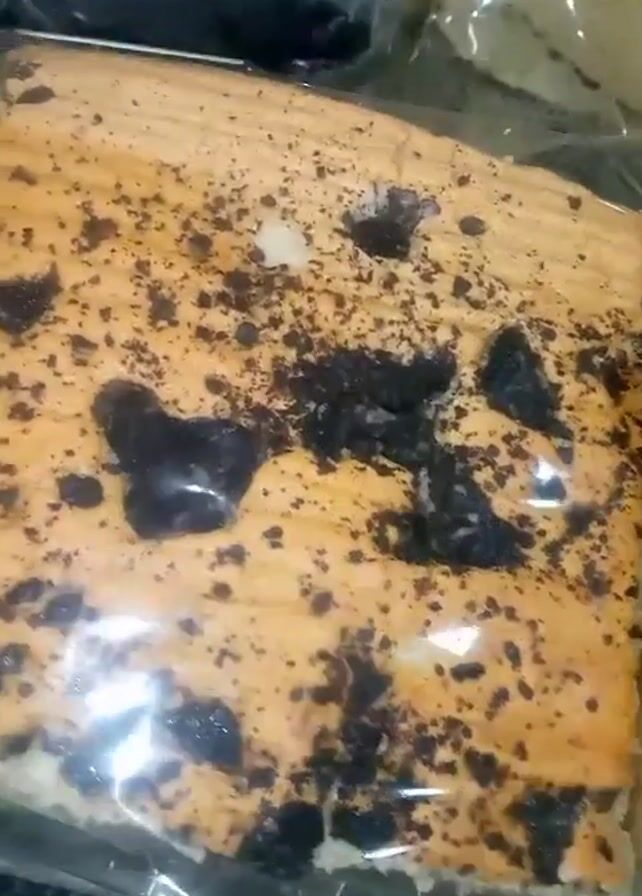 A close-up, indoor video displays a tray of packaged baked goods. The main focus is a rectangular piece of cake, wrapped in clear plastic. The cake has a light-colored base, a white layer in the middle, and a tan top covered with dark, irregular specks. A similar piece of tan cake sits next to it, also wrapped in plastic. Both items are on a silver tray, and a third packaged cake is slightly visible in the background.