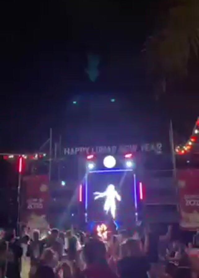 A lively outdoor party is in full swing at night, celebrating the Lunar New Year. A large crowd of people is gathered, silhouetted against a stage that reads "HAPPY LUNAR NEW YEAR." The stage is elaborately lit with red, green, and blue lights, and a bright screen displays an animated figure dancing. The lighting effects are dynamic, with beams of light sweeping across the crowd. A palm tree is visible on the right side of the frame, adding a tropical feel to the event. The atmosphere appears festive and energetic, with the crowd seemingly enjoying the celebration.