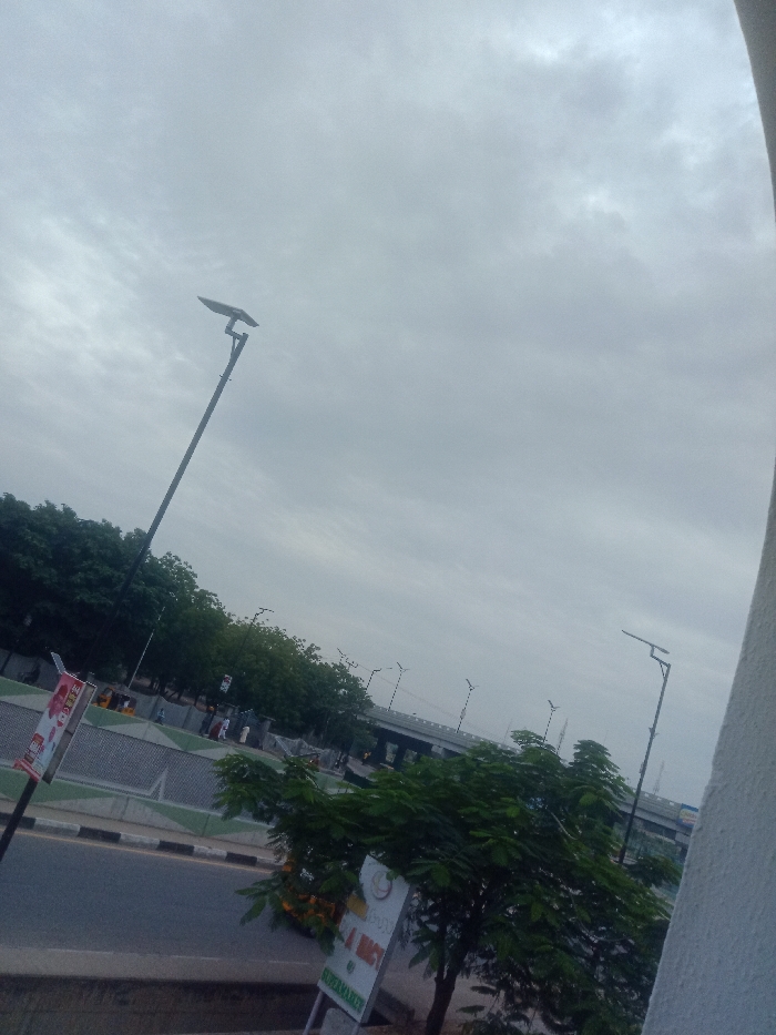 The image depicts an urban street scene in Tarauni, Nigeria, under an overcast sky. The sky is uniformly light grey, indicating diffused daylight. In the foreground on the right, a white architectural element, likely a building wall or column, frames the view. Below it, a medium-sized tree with green foliage stands next to a partially visible white sign with green lettering, which includes the word "SUPERMARKET." The midground features a multi-lane paved road, likely asphalt, running horizontally. A concrete barrier or median, painted with green and grey sections, separates the roadway. Tall, dark-poled street lights equipped with solar panels and LED fixtures are positioned along the road and in the distance. One prominent street light is visible on the left side of the road, and another appears further right. On the left side, beyond the road, a dense line of green trees forms a backdrop. Several indistinct human figures are visible on a pedestrian area or roadside to the left of the road. A yellow vehicle, possibly a tricycle or small car, is partially visible on or adjacent to the road on the left. Another vertical sign, white with red graphics, is present on the far left. In the background, an elevated concrete bridge or flyover structure, supported by multiple pillars, spans the view from center-right. Additional street lights are visible along this distant bridge structure.