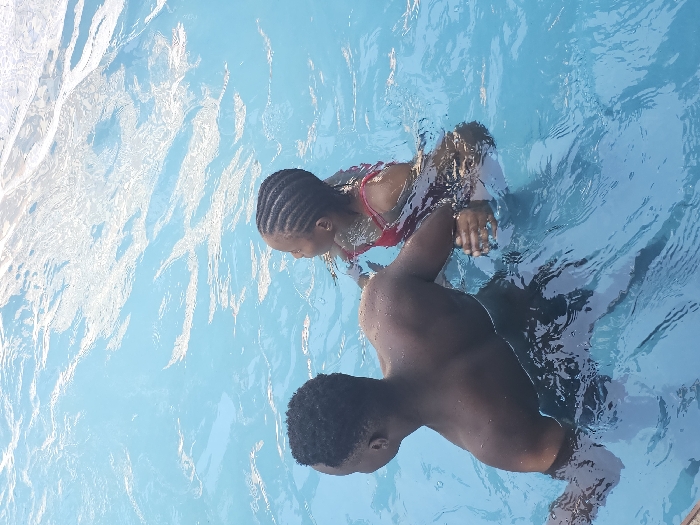 This image depicts two individuals submerged in the light blue water of a swimming pool in Asaba, Nigeria