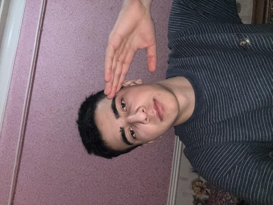 A young man with dark hair is featured in the image. He wears a striped, dark-colored shirt. His right hand is raised, palm facing forward, positioned near his forehead in a gesture resembling a salute. The background consists of a light purple or pink wall. The man looks directly at the camera. The image appears to be rotated, as the wall is on the left and top of the frame, and a glimpse of flooring is visible on the right.