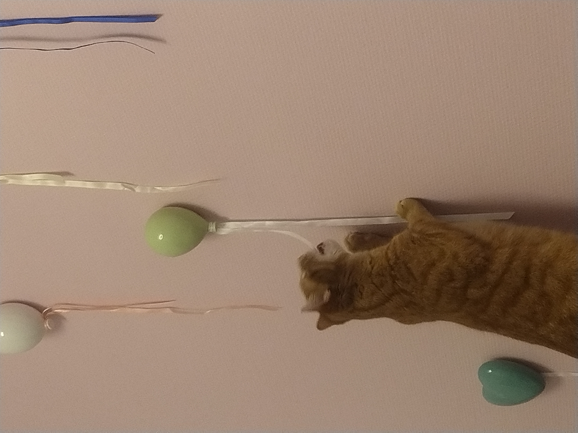 An indoor scene, situated in Berchem, Luxembourg, displays an orange tabby cat standing on its hind legs against a plain, light pink wall. The cat is viewed from a rear-right angle, with its body elongated in an upward stretch. Its front paws are extended, appearing to grasp or interact with a white ribbon. This ribbon is anchored to a spherical, light green wall decoration resembling a balloon, positioned in the upper right quadrant. Another spherical, off-white wall decoration, also resembling a balloon, is affixed to the wall in the upper left, from which a light peach-colored ribbon descends. Further to the right of the central focus, multiple vertical ribbons are visible, including a white ribbon, a thin dark cord-like ribbon, and a blue ribbon. In the lower left, a small, light teal heart-shaped wall decoration is present.