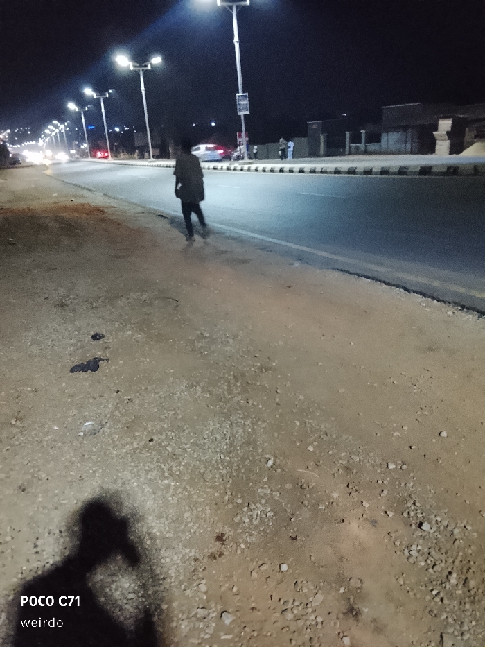 A figure walks alongside a well-lit road at night. Streetlights illuminate the scene, casting long shadows. Cars are visible in the distance, and buildings line the roadside. The shoulder of the road is rough and gravelly. In the foreground, a blurry shadow is visible, along with the text "POCO C71 weirdo".