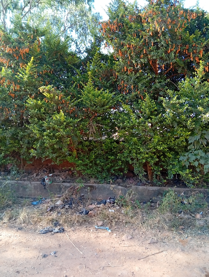 A row of green bushes and trees with scattered orange flowers lines a raised concrete curb. Litter and debris are scattered in front of the curb, intermingled with dry grass and weeds. A dirt path or road is visible in the foreground, suggesting a roadside or edge-of-field setting. The overall impression is of untidiness and a need for landscape maintenance.