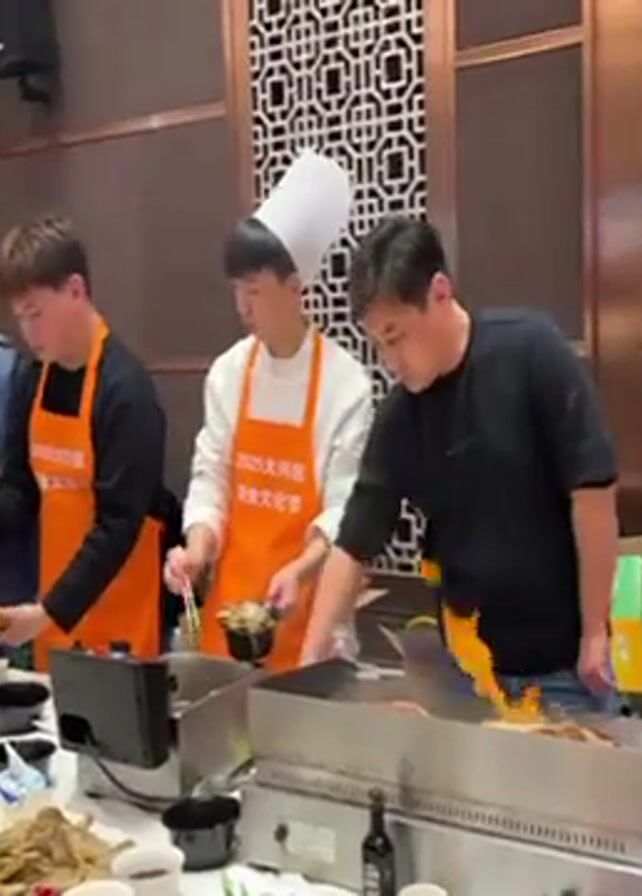 Five men are gathered around a long table preparing food. The men are wearing orange aprons with Chinese writing on them. One man is wearing a chef's hat. The table is covered with various cooking appliances, ingredients, and prepared food. The man on the left is stirring food in a yellow pan. The man in the middle is transferring food from a small bowl. The man on the right is cooking food on a flat griddle. The background includes decorative wall panels and other individuals not actively involved in the cooking process. The overall atmosphere appears to be a cooking demonstration or competition.