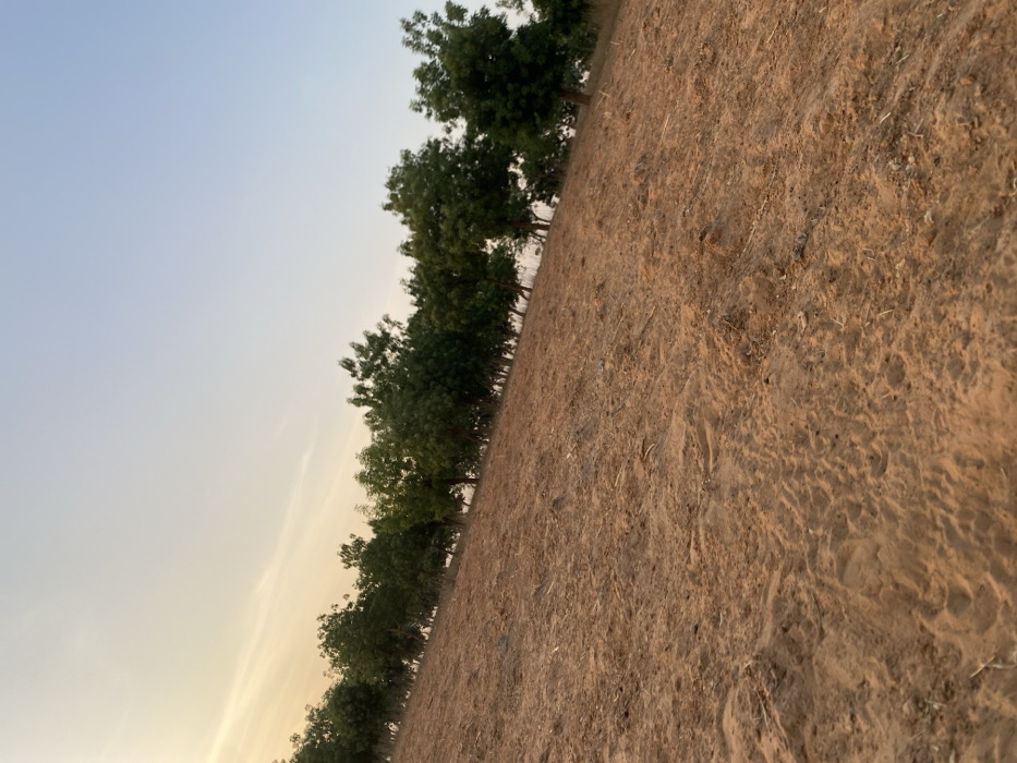 The landscape shows a line of trees against a pale sky, possibly at dawn or dusk. The ground is covered in dry, sandy soil with visible textures and patterns. The camera angle is skewed, tilting the horizon diagonally across the frame. The scene conveys a sense of rural tranquility and natural simplicity.