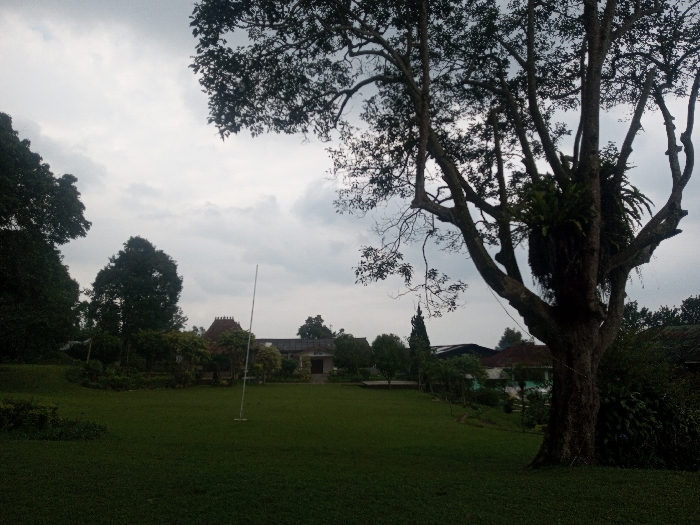The scene is an outdoor landscape located in Nghĩa Đồng Commune, Vietnam, under a heavily overcast sky. A large tree with a thick, dark trunk and extensive, gnarled branches, bearing several clumps of epiphytic ferns, dominates the right foreground. The ground immediately visible consists of a sprawling, neatly maintained green lawn. In the midground, slightly to the left of the center, a tall, slender, light-colored pole stands vertically in the grass. Beyond the lawn and a line of varied trees and dense shrubbery, several structures are visible in the background. One prominent building exhibits a multi-tiered, dark-tiled roof, consistent with traditional Vietnamese architecture. Other buildings, featuring lighter-colored walls and dark roofs, are partially obscured by foliage. No individuals or discernible actions are present within the frame.