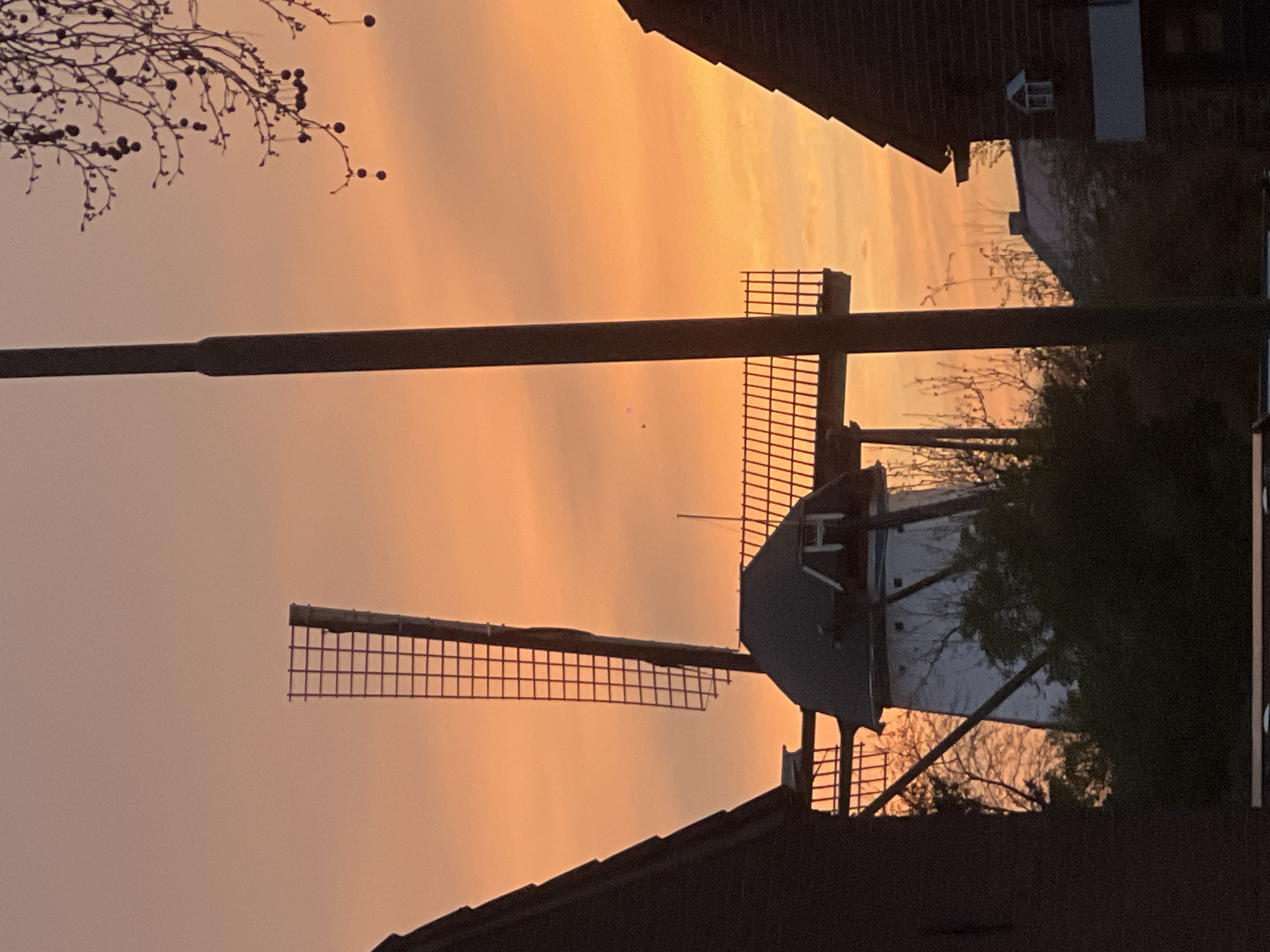 The image depicts the Geldropse Molen windmill in Geldrop, Netherlands, silhouetted against a radiant orange and yellow sky, indicative of sunset or sunrise. The windmill features a white base, a dark conical cap, and two prominent sails with a grid-like framework; one sail extends vertically, and the other horizontally. Dark-roofed buildings partially frame the scene on the left and right; the structure on the right is brick-faced, presenting a gable roof, a small white dormer window, and a rectangular white panel on its lower facade. A dark utility pole stands vertically on the right side of the frame. Bare tree branches, some bearing small, dark, round berries, hang into the upper right portion of the image. Dense, dark foliage and additional bare tree branches are visible in the mid-ground and lower sections, obscuring the ground level and lower windmill components. No individuals or specific actions are discernible within the scene.